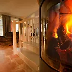 A patio and a seating area are appointed with an ironing set for ultimate guests' comfort. Along with a sofa, the interior features a fireplace. This villa comes with a bathroom with a separate toilet, a bath, and a shower. There are also hair dryers and towels.